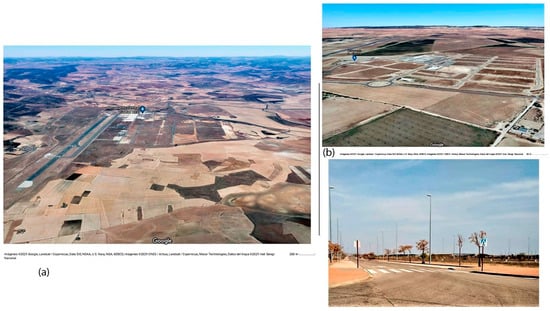 (a) Ciudad Real airport, left; (b) vacant lots at the aeronautics and logistics park in Albacete, right. Sources: Google Maps, use permitted for non-commercial purposes (https://about.google/brand-resource-center/products-and-services/geo-guidelines/#google-maps (accessed on 19 August 2021)), and photograph by J. A. García (April 2021), used with permission. If interested, the reader can request further photos from the author by email at: luisalfonso.escudero@uclm.es.
