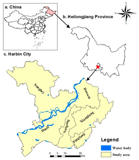 Study area. Harbin lies in the southern region of Heilongjiang province, which is located in Northeastern China.
