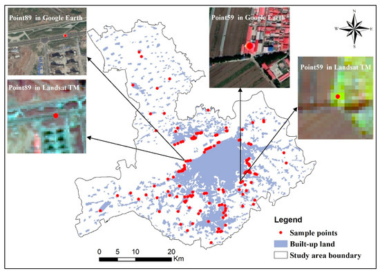 We used ENVI 5.3 (http://www.esrichina.com.cn/, accessed date 1 September 2018) to preprocess each image, which involved geometric correction, layer stacking, image color enhancement processing, and clipping. We synthesized simulated true color (band 7, 4, 3) and standard false color (band 4, 3, 2) images for Landsat 4-5 TM. For Landsat 8 OLI/TIRS, we used the band 8 (full color channel) to sharpen images with the Gram-Schmidt Pan Sharpening tool, thereby forming a standard false color (band 5, 4, 3) image with a 15 m resolution. After these procedures, the built-up vector data was obtained by supervised classification and visual interpretation. We compared images in different seasons and/or years to reduce the impact of similar materials with different spectrums, or similar spectrums corresponding to different materials, on image interpretation. In this study, we assumed that built-up land expansion was irreversible during urban development [55]. Parks and green spaces were classified as built-up land because they contribute to ecological and entertainment functions within a city; this classification is also consistent with the definition of built-up land in the “Code for classification of urban land use and planning standards of land development” established by the Ministry of Housing and Urban-Rural Development of the People’s Republic of China. We randomly selected 150 sampling points of the built-up land in Google Earth that changed from non-built-up to built-up in 2015. Comparing these sampling points with the interpreted data, we found that the accuracy of the built-up vector data was 96% (Figure 2).
