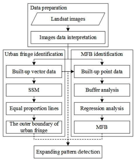 Data analysis involved three main steps (see Figure 3): (a) the Spatial Segmentation Model (SSM) was generated to convert the built-up land data into comparably discrete values, then we obtained the inner and outer boundaries of the urban fringe according to the chosen threshold values; (b) the maximum fragmentation boundary (MFB) was calculated using buffer analysis and regression analysis; and (c) urban expanding patterns were used to analyze urban growth evolution processes using the calculated the numbers of built-up patches in each 10-degree section within the urban fringe, the MFB, and the outer boundary of the urban fringe. These steps are detailed below.