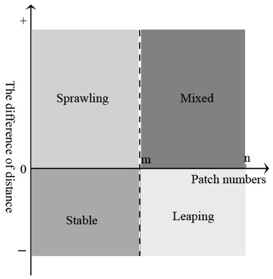 According to the results, urban expanding patterns fell into four types: stable, leaping, sprawling, and mixed. These four patterns are defined below (see Figure 4). The stable pattern refers to relatively slow urban expansion in which the degree of built-up land fragmentation is smaller, the difference of the boundary distance is negative, and the number of built-up patches is lower. The leaping pattern involves active urban expansion in which the degree of built-up land fragmentation is higher, the difference of the boundary distance is positive, and the built-up land proportion is larger. The sprawling pattern refers to active urban expansion with a degree of built-up fragmentation less than that of the leaping pattern, with positive boundary differences, and a number of built-up patches that is less than or equal to that of the leaping pattern. Lastly, the mixed pattern refers to the coexistence of leaping and sprawling patterns in areas where it is difficult to distinguish between the two.