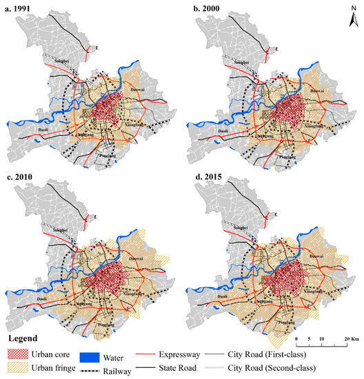 The road density’s significant variations, due to the differences in population density, developing positioning, and spatial functions in different zones, are shown in Table 2. Due to its intensive building footprint, the roads density in the urban core are higher than in the urban fringe. The expressway distributes outside the urban core and 0.0 km/km2 in the urban core, which mainly provides transportation services between urban and rural areas as well as between different cities. For both the urban core and urban fringe, the roads density slightly decreased during 1991–2015. Comparing values in the city roads showed that the road density of the first-class city road in the urban core was 4.2 to 7.7 times greater than in the urban fringe. The ratio for the second-class city road was between 4.1 and 5.5. Due to increased transportation investment, roads in the urban core were more dense than in the urban fringe, covering almost a third of the total area of the urban core [19,63]. The road density of the second-class city road was twice that of the first-class city road, which suggests that people need more short-distance roads.