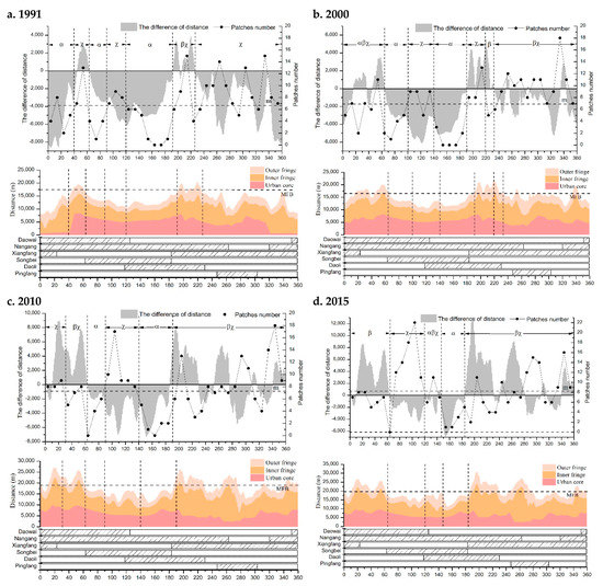 Urban expanding patterns were used to explore forms and the extent of urban spatial growth in each direction, and were calculated using the outer boundary of the urban fringe, the MFB, and numbers of built-up patches. The calculations proceeded as follows. First, the outer boundary of the urban fringe and the MFB were distributed in 360 degrees. The difference between the outer boundary of the urban fringe and the MFB indicates the dynamism of the urban expansion. Positive values indicate urban active expansion, while negative values indicate relatively slower urban expansion. Then, the number of built-up patches was calculated in each 10-degree section in the urban fringe. These values were greater than or equal to zero, where larger numbers indicated greater degrees of built-up land fragmentation [60,61,62].