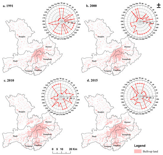 Changes of urban expanding patterns in different directions and the distribution of built-up land indicate urbanization trajectories, which can be found in Figure 7. The proportion of stable pattern was 5/12 in 1991, 4/12 in 2000, 3/12 in 2010, and 3/12 in 2015. Correspondingly, the proportion of leaping patterns was 17/36 in 1991, 14/36 in 2000, 11/36 in 2010, and 10/36 in 2015. Obviously, stable patterns and leaping patterns decreased during this rapid urbanization period, indicating that built-up land sprawled out. In the 60–180 degrees sections, the built-up land was stable during 1991–2000, and obviously increased during 2000–2010, because the Songhua and Ashi Rivers run through Songbei and Daowai Districts. In the 180–230 degrees section, sprawling and leaping patterns coexisted. The leaping pattern decreased and those with sprawling patterns increased; the main reason for these changes was the increase in built-up land along both sides of the Airport Express to Harbin Taiping Airport. In the 230–330 degrees section, four urban expanding patterns coexisted. The leaping pattern dominated in 1991, and then was gradually replaced by the sprawling pattern. Traffic nodes and routes played a leading role in these changes. Harbin West Railway Station and Harbin South Railway Station both contributed to conversion of surrounding lands into built-up land. South of Harbin, built-up land sprawled under the impact of Hashuang Road, Beijing-Harbin Expressway, and Haping Road. In the 330–60 degrees section, the stable and sprawling patterns converted to mixed patterns between 1991 and 2015. Gongbin Road and Hacheng Road provided conditions well suited to the expansion of built-up land.