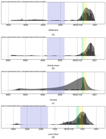 Another recent Scandinavian study by Hennius utilized the KDE method to refine the chronology of pitfall hunting in Sweden [49]. His results challenged the previous assumption of the importance of hunting and trapping in the Viking Period. Our results support his refined chronology of pitfall hunting while indicating an upturn in metal production and land claims during this period; these results call for a more focused comparison against the period’s environmental factors to explain this concentration of niche practices.