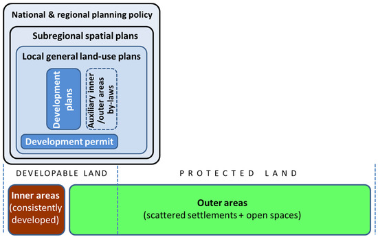 To sum up, there are two main land classes in Germany: consistently developed (urbanised) areas (i.e., inner areas) and other areas that consist of open land and scattered settlements (i.e., outer areas). The outer areas are generally protected from ordinary development. General local land-use plans indicate inner areas (precisely delimitated in municipal by-laws) and an extent of outer areas that may be subject to prospective urban development. There are two possibilities to urbanise such land: either issuing a detailed development plan or an auxiliary by-law. These instruments are not required to obtain the development permit on inner areas. Municipal general land-use plans have to follow concrete objectives of subregional spatial plans as well as national and regional planning policy (see Scheme 1).