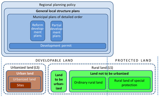 There is no universal Spanish spatial planning system. The legal power to establish it belongs to autonomous regions. In the autonomous Community of Valencia the planning enactment is the Ley de Ordenación del Territorio, Urbanismo y Paisaje, de la Comunitat Valenciana [46]. However, the national legislation sets legal foundations of property rights in spatial management. Such enactment is the Land Act (Ley de Suelo) [106].