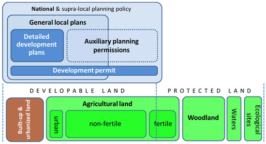 In Germany, the designation of developable land is regulated by all levels of land-use planning. The federal and state planning (Raumordnung) states general rules (Grundsaetze der Raumordnung) of urban development to be followed by lower-level planning bodies. Two main federal enactments regulating planning at distinct scales, namely, the Spatial Planning Act (Raumodnungsgestz (ROG)) [98] and the Building Code (Baugesetzbuch (BauGB)) [99] recognise the problem of overconsumption of open land for construction purposes. Minimising the quantity of open land consumed (Inanspruchnahme der Freiflaechen) for the purposes of settlement and transport, as well as the rule of using land in a thrifty way (sparsame Flaechenutzung), are embedded in the overarching Spatial Planning Act [98] (art. 2.2.6) and the Building Code that provides rules for urban planning at the local scale [99] (art. 1a.2, 9.1.3).