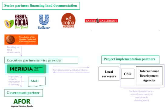 Existing research has explored land administration interventions in the frame of partnerships mostly funded by donors, where the private sector actors involved tend to come from within the land sector, as service providers, and their involvement is often merely focusing on technical delivery [9,10,11]. It is therefore worthy to continue exploring novel ways in which broader private sector actors, such as food and agricultural sectors, who may often deeply rely on land tenure security, can engage in the land administration initiatives through partnerships.