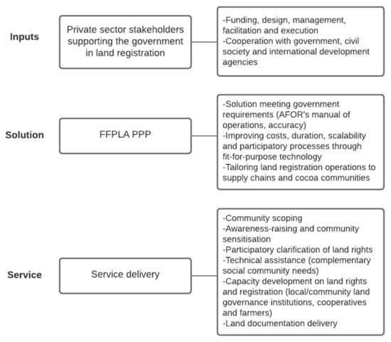 Fundamentally, the exploratory work underpinning this paper can be considered to follow the interpretivist, if not pragmatic, research paradigm, and subsequently a qualitative research methodological approach could be applied. Specifically, in order to respond to the aims of the paper, that is, to further explore and expand upon knowledge relating to the use of PPPs in FFPLA, and to introduce a new type of PPP, a case study approach was applied. Specifically, a case study of the ‘Côte d’Ivoire Land Partnership’ [36], was undertaken, and the potential innovations to PPPs in land administration were explored. The case study initiative was selected because of the familiarity of the authors with the case. This potential for bias needs to be acknowledged. The case study largely included collection and analysis of secondary data sources, although the author experiences also informed the critique. The case study was exploratory in nature, rather than explanatory or confirmatory. The aim was to explore the involvement of non-conventional private sector actors in innovative FFPLA partnerships—in terms of how they might engage actively, or not, in securing land rights for vulnerable smallholders in developing countries.