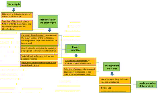 One of the important phases of this ecological restoration project was to decide the goals, aims, and priority actions [31,45] (Figure 2). Therefore, the starting point of the methodology applied was to site analysis combining GIS analysis with field activities to pinpoint the potential sites of interest for the project, i.e., those that were connected with specific elements of the landscape that were already known. This included the phytosociological analyses of the vegetational characteristics of the areas identified in the first step, and assigning at each representative species a coverage value according to the Braun-Blanquet ordinal scale [46].