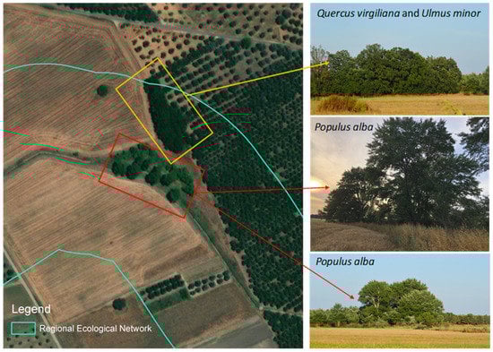 The relevance of regulation functions is limited in consideration of the extensions of the habitat restoration. Instead, the Habitat functions, Information functions and Carrier functions can have high relevance independently from the dimension of the area restored. These habitats will constitute reserves of biodiversity within an agricultural matrix, where autochthonous and nesting species of birds, reptiles, and amphibians typical of riparian habitats will find refuge. Furthermore, these habitats will also be a source of biodiversity because plants such as Quercus virgiliana will be able to continue to propagate, guaranteeing both the sustenance and regeneration of the forest over time and the spread of coverage to neighbouring areas where, in conditions of non-human disturbance, they can develop other small, wooded areas. Furthermore, these wooded areas and new anthropic elements introduced to replace the old types will constitute hotspots of natural vegetation in a strongly anthropized matrix, providing a series of natural “stepping-stones” for the transit and refuge of fauna [64,65] (Figure 9).