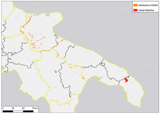 This habitat is widespread in Italy, but on a regional scale, being mainly concentrated in the north and not reported in the south of Puglia, including the Province of Lecce (Figure 5). Therefore, the project will enhance and enrich biodiversity in southern Puglia by creating natural patches that ensure conservation and ecological enhancement in an otherwise purely agricultural landscape.