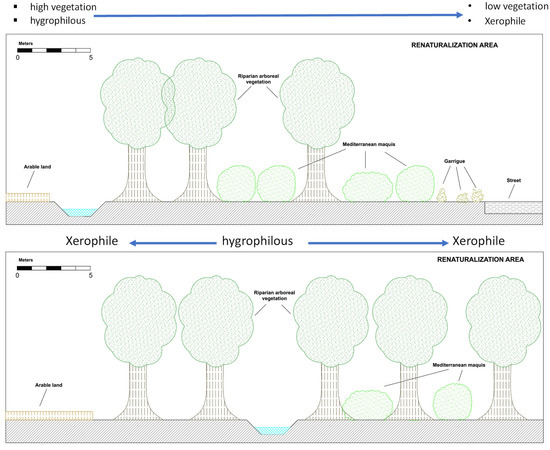 The planting of the vegetation sought to achieve seriation similar to the natural habitat, particularly concerning the Salix alba and Populus alba galleries. In this regard, the intention was to create a gradual transition from hygrophilous plants (near the channel) to increasingly smaller xerophilous species (scrub and garrigue) towards the surrounding agricultural land (Figure 7). To simulate a natural ecosystem, the planting was performed randomly, with no geometrical shape or pattern.