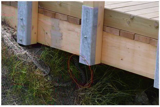 The red circle highlights an Natrix natrix (Linnaeus, 1758) detected during a survey in the realisation phase of the project in one bridge that was constructed to replace an old cement bridge and sides.