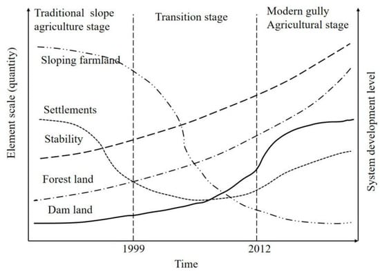 The phenomenon of GAPT in the LHGR reveals the general law of the evolution of the river basin and rural man-land system driven by ecological construction and gully land consolidation engineering, that is, ecological security and food security. In the new era, the gully agriculture of the Loess Plateau should be based on the economic-ecological “win-win” benefits, focusing on ecological civilization and green sustainable development, and using the two major projects—the Grain for Green project and Gully Land Consolidation—as important platforms for transformation and development, and coordinating watersheds up-and-down collaboration, gully and slope collaboration, multi-scale classification and coordination, giving full play to the technical support role of geographic engineering, and in-depth exploration of new ways to optimize gully agricultural production methods and innovate business management models. As the goal, the ecological economy is “win-win” as the direction, and modern geographic engineering is the technical means to finally achieve high-quality development of quality benefits and development efficiency [48]. GAPT in the LHGR has promoted the integration of policies such as the Grain for Green project and Gully Land Consolidation. On the premise of protecting and improving farmers’ livelihoods, it is important to promote the integration of the three beings (production, living, ecological) in the gully region and bring to light the significance of promoting the integration of the three industries and high-quality development of the Loess Plateau.