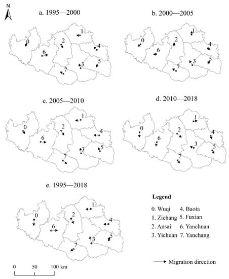 The center of gravity coordinate migration of gully farmland in districts of Yan’an City.