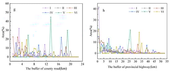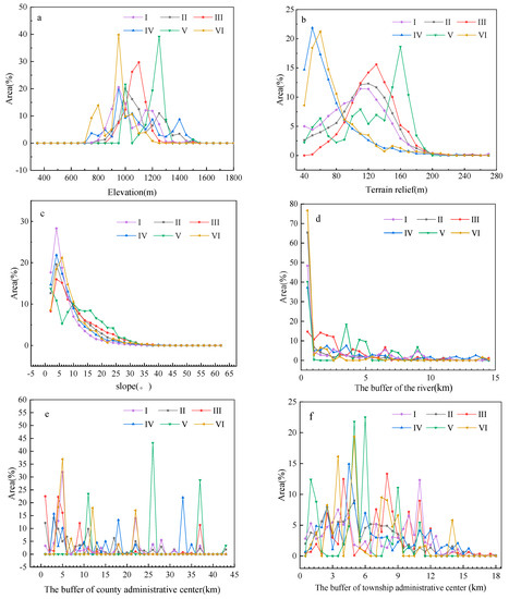 The spatial distribution characteristics of different types of gully farmland are shown in Figure 6. The growth of the gully farmland is mainly distributed in the relatively gentle low-altitude flat dam area, including elevation (700–1300 m), terrain relief (40–180 m), and slope (0–20°). The growth of oilseeds (IV), mulberry leaves (V), and tobacco leaves (VI) were negatively correlated with the distance between rivers, county roads, and provincial roads, and the increase was mainly within 5 km from rivers and 18 km from provincial roads. In general, the influence of the regional centers of townships on the cultivation of gully farmland was more significant than that of the regional centers of districts and counties. There was a strong market location orientation between economic fruit forest (I) and greenhouse vegetables (II), which was more manifested as agglomeration within the township, showing a “bottom-up” market location-oriented law.