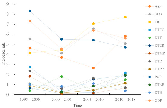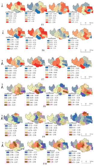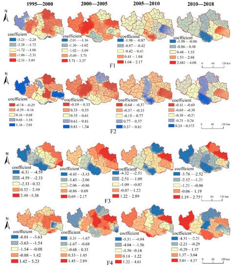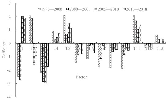 The factor coefficients of the four stages in the study area from 1995–2000, 2000–2005, 2005–2010, and 2010–2018 were statistically separated, and the average factor coefficients of each stage were obtained as shown in Figure 8.
