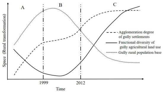This paper represents the general law of gully rural land use in LHGR, and the process of GAPT can reveal the LUT mode in China’s loess plateau and modern gully man-land system development in LHGR (Figure 10). With rural population outflow, GAPT will promote the gully living space reconstruction and intensive use of production, and the man-land system development tends to be coordinated and efficient. Specifically, GAPT reflects the characteristic of gully agriculture crops, ecological maintenance, and rural living environment construction in LHGR. The combination accelerates rural transformation in LHGR, which has an indicative implication for the high-quality development of agriculture and rural in China’s Yellow River Basin.