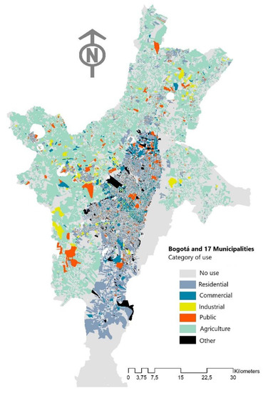 From the Bogotá District Secretary for Planning (http://www.sdp.gov.co/content/visor-encuesta-de-esestantación-economicos, accessed on 12 August 2021), the information was taken from the Bogotá-Regional Economic Enterprise Survey (EEERB); from IDECA (https://www.ideca.gov.co/, accessed on 12 August 2021), the cadastral information of Bogotá was taken; and from the IGAC (https://www.igac.gov.co/, accessed on 12 August 2021), the cadastral information of the municipalities of Cundinamarca was obtained.