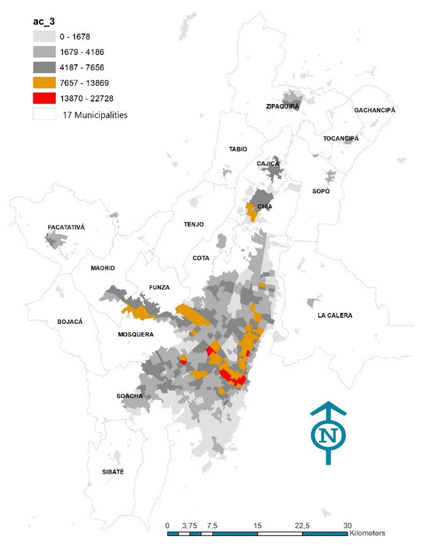 The regional accessibility pattern indicates the concentration of employment, and therefore, economic activity in the regional space. As expected, the highest indicator values were found in Bogotá as the main city, explaining most of the agglomerations that have previously been identified in the literature; specifically, business centers, industrial and commercial areas, and the airport.