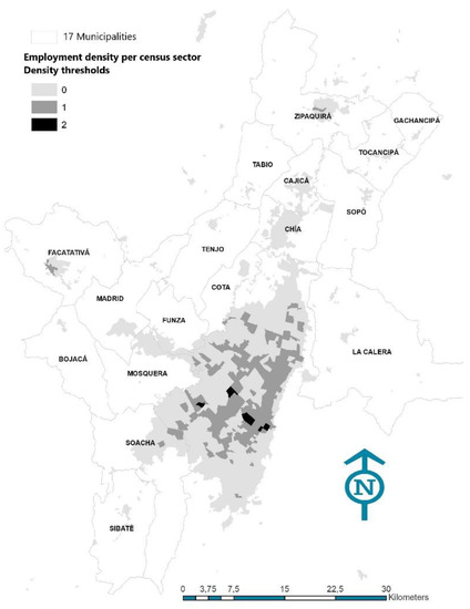 Employment densities in Bogotá and 17 municipalities, 2017, using methodology proposed by [44]. Based on information from the EEEBR (2017).