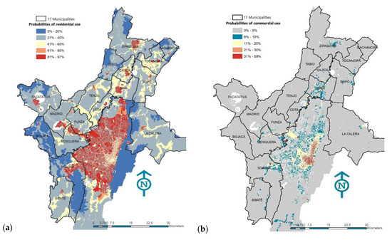 The model estimated with the specification of Equation (7) for the study area allows the calculation of the probability that a land use is located in a specific area of the regional spatial structure (Figure 2). This takes into account spatial characteristics that we include as explanation variables in the econometric model, such as accessibility conditions, distance from main roads and the following additional control variables: binary variables for expansion zones and suburban zones of Figure 1 (which allow for the consideration of potential growth in the urban footprint of each municipality); geographical restrictions, based on information from the IGAC regarding highland “paramo” areas, forest protection areas and freshwater bodies and the main restrictions for growth of urban areas in the municipalities; the urban/rural variable that takes the value of 1 in urban areas and 0 in rural areas; and the coordinates (X, Y) that are included as a control for unobserved spatial effects.
