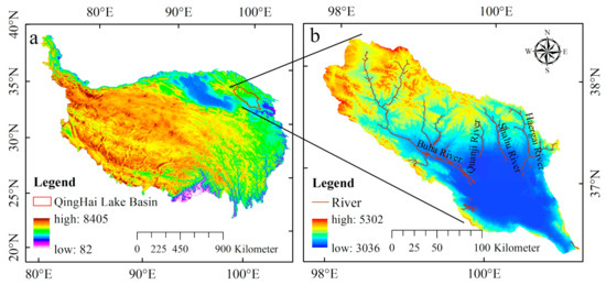 Location of the Qinghai Lake Basin (b) on the Qinghai–Tibet Plateau (a).