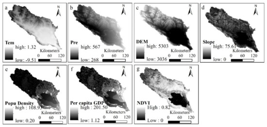 Driving factors of land use change in the QLB. (a) annual average temperature; (b)annual precipitation; (c) DEM; (d) slope; (e) population density; (f) per capita GDP; and (g) NDVI.