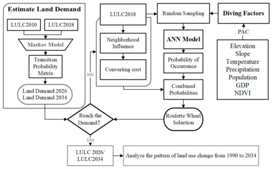 The purpose of this study was to investigate landscape pattern changes from 1990 to 2018 through the analysis of LULC maps and to forecast changes in the QLB over the next 16 years, from 2018 to 2034, using the FLUS v2.4 Model. The Markov model is a stochastic method used to describe the land demand with a transition probability matrix in land use change analysis [36] and has been widely used in ecological modeling to predict land use demand under future scenarios [37]. Based on the quantity of land use, the FLUS model was applied to simulate the spatial distribution of land use in the future. On this basis, statistical methods and a transfer matrix were used to analyze the land use pattern and identify the spatiotemporal change characteristics of land use in different periods. The future scenario assumes that development in the study area in the near future will proceed without natural disasters or sudden swings and changes in the economy and public policy. In the present study, the future scenario refers to a scenario in which the trends of changes in LULC from 2010 to 2018 will continue unaltered until 2026 and 2034, regardless of the modeling variables and human factors. The methodological framework used in the study for the simulation of the LULC is shown in Figure 3.