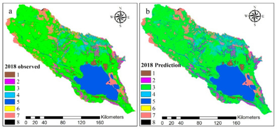 Observed (a) and predicted (b) LULC maps for 2018. 1—cropland, 2—woodland, 3—grassland, 4—wetland, 5—water area, 6—developed land, 7—desert, 8—glacier.
