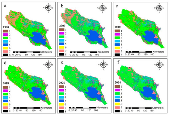 Spatial distribution of landscape types in the QLB. (a) 1990, (b) 2000, (c) 2010, (d) 2010, (e) simulated 2026, and (f) simulated 2034. 1—cropland, 2—woodland, 3—grassland, 4—wetland, 5—water area, 6—developed land, 7—desert, 8—glacier.