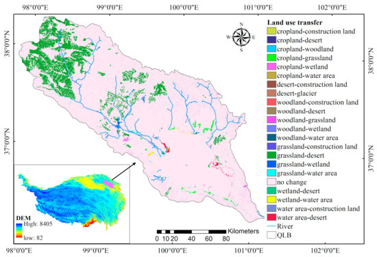 With the progress of society and economic development, the QLB has developed rapidly due to the unique plateau scenery and ethnic culture, as well as the changes taking place in LULC. These changes should be monitored and analyzed in order to adjust relevant policies. Our study revealed the positive impact of the implementation of national environmental protection policies on the change of the local landscape types.