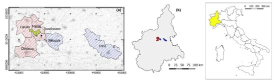 Figure 1. Location of the study area within the Piemonte Region and Italy (b). In (a) the administrative boundaries of the involved municipalities (Mazzè, Caluso, Rondissone, Chivasso, Trino, Saluggia) are reported together with the TO-10 area. In blue, the Saluggia and Trino municipalities presently hosting radioactivity-related facilities. Reference system is WGS84 UTM 32N.