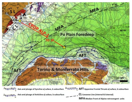 26. Roure, F.; Polino, R.; Nicolich, R. Early Neogene Deformation beneath the Po Plain: Constraints on the Post-Collisional Alpine Evolution. Mémoires Société Géologique Fr. 1990, 156, 309–321. [Google Scholar]
