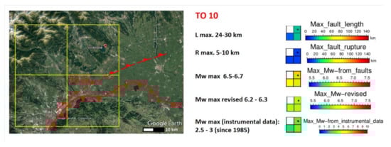 Seismic Hazard Maps of Italy are determined on the basis of the known instrumental and historical seismicity that is reported in the Parametric Catalogues of Italian Earthquakes (see http://emidius.mi.ingv.it/CPTI/, [], accessed on 13 May 2021) and in the Catalogue of Strong Earthquakes in Italy (http://storing.ingv.it/cfti/cfti5/, [], accessed on 13 May 2021). In these catalogues, the “older” recorded earthquakes date back to 217 B.C. and 461 B.C., respectively, showing to be clearly incomplete for previous periods. Therefore, the EC2 exclusion criterion defined in [] is in itself hard to be applied, given the limited information on earthquake dates and their correspondent magnitudes; in fact, the EC2 criterion explicitly refers to the events occurred in the 2475 years B.P., that were not recorded. Certainly, this deficiency is even more significant if one has to refer to the time-scale of geological processes. With these premises, interesting information come from the study conducted by the Department of Earth Sciences of “La Sapienza” University (Roma) and commissioned by Sogin []. This research integrates rheology of the lithosphere of the Italian peninsula with the active regional tectonics, by jointly analysing available geological, geo-structural and geophysical information. In [] authors explored the whole Italian territory using a 25 × 25 km sized grid. With reference to the crustal thickness and depth of the lithospheric mantle, they calculated the local maximum differential stress for rupture of the lithosphere. Calculations were completed with (a) the analysis of the deformation vectors as measured by networks of GNSS permanent stations, (b) the stratigraphy of deep wells drilled by ENEL and AGIP; (c) the “database” of Italian major faults (DISS, ITHACA, GNDT). Results were synthesized in the “Maps of the maximum expected magnitude on geological-geophysical basis” for earthquakes potentially occurring within each of the 25 × 25 km cells.