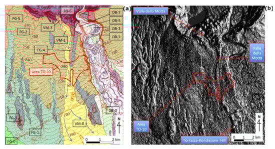The area, extending Southward of the Ivrea moraine arc, consists of glacio-fluvial sediments deposited in the frontal zones of the Pleistocene glaciers that descended along the Aosta Valley from the Monte Bianco Group [,,]. Area slopes range from 1.6°, close to the frontal moraines in the north, to 0.6° in its southern part, where the Monferrato hills (the front of the Apennine) interrupt the plane and the Po River flows eastward. The fluvio-glacial plane is dissected NW-SE by a deep incision that forms the “cañon” of the Dora Baltea river (Figure 6—left). This cañon has been, and is currently being, cut in the unconsolidated glacio-fluvial deposits for a depth of about 60 m and a width of 2200 m. The sides of the cañon are occupied by a set of fluvial terraces and abandoned riverbeds, that are mapped in Figure 6, []. A set of older glacio-fluvial terraces can be also identified in the glacio-fluvial plane bordering the cañon including the “Valle della Motta” (close to the TO-10 area) drainage system. The Dora Baltea cañon exits the Ivrea moraine arc, forming four major entrenched meanders, signed on their top by paleo-meanders, fluvial drainages and terraces; these testify that the river in the past was at a higher altitude than presently, although flowing close to its equilibrium profile. On the flanks of the canon, 7 terraces can be recognized ranging from the younger ones, lying along the river, to the older ones found at higher altitudes. Downhill of this first section, the river anatomizes (with no more entrenched meanders) and flows into several riverbeds with few terraces left on the sides. Loose, easy-erodible, glacio-fluvial sediments that constitute both the sides of the Dora Baltea cañon up to the very top and the high-erosion potential of this river indicate a very young age for the formation of the cañon (younger than the latest Pleistocene glaciation). It is worth to remind that the Dora Baltea is the largest tributary of the NW sector of the Po River basin; in 2000 the Dora Baltea flooded with a flowrate of about 3000 m3/s at the intersection with the Po River, itself having a flowrate of about 5000 m3/s [].