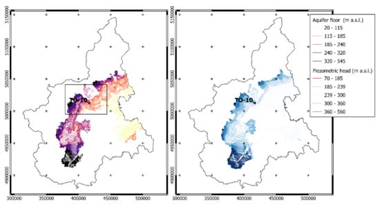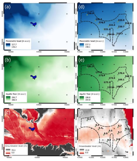 Figure 10. Raster maps of: (a) PH(x,y): altitude a.s.l. of the piezometric head of the aquifer (landscape level); (b) AF(x,y): altitude a.s.l. of the floor of the aquifer (landscape level); (c) GL(x,y): groundwater level (meters from the ground) of the aquifer (landscape level); (d) PH(x,y) in the TO-10 site; (f) AF(x,y) in the TO-10 site; (c) GL(x,y) in the TO-10 site. In (ac) blue polygon defines the TO-10 area. In (df) some numerical values are reported for random pixels. Raster maps were generated by spatial interpolation from line vector layers with a grid size of 100 m. Reference system is WGS84 UTM 32N.