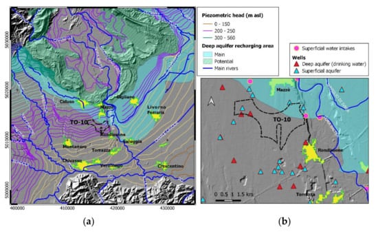 Figure 8. (left) Hydrogeological sketch of the TO-10 site and its surroundings. Contour lines for isopiezometric heads show the groundwater table geometry. Light blue areas report the recharge areas of the deep aquifer (that provides drinking water). In yellow the main towns around the area; blue lines represent the main hydrological network. (right) Detail of the TO-10 area and its surroundings: (a) the recharge area of the deep aquifer is partially included in the site; (b) several wells are located nearby or within the area; eight out of them catch the water from the deep aquifer. Reference system is WGS84 UTM 32N.