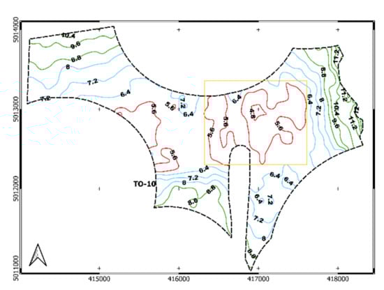 In fact, the correspondent 1 km buffers split the TO-10 site into two separated areas, the greatest reaching about 124 ha. Given the resulting shape of the residual suitable area the preliminary project of the repository proposed by Sogin [] is practically unfeasible. Moreover, this remaining area is located exactly where the groundwater table is confined at a lower depth (less than 5 ± 4.55 m from the ground, see Figure 11).