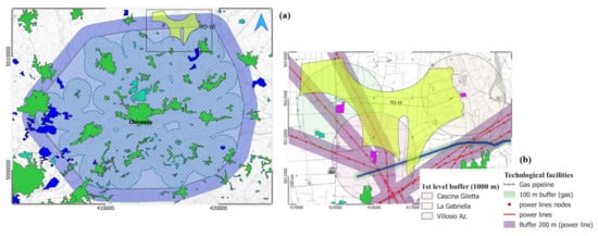 Figure 12. (a) 2nd level buffer (“local urbanism”) of the Chivasso municipality. The external blue polygon is the buffer area around the convex-hull defining the local urbanism of Chivasso mapped according to the procedure reported in []. (b) 1st level buffers (circular, 1 km radius) around the three settlements (Cascina Giletta, Cascina Gabriella and the Villosio bio-gas production plant) that Sogin didn’t consider during its evaluation, since not mapped in the ISTAT LOC2011 layer. In (b) power and gas lines layouts are also reported together with correspondent safety buffers (200 m for power lines and 100 m for gas lines) as required by Italian regulations.