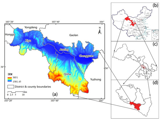 (a) Geographic location of the study area showing the elevations of Chengguan, Anning-Qilihe, and Xigu central areas. Inset maps show (b) the location of Gansu Province within China; (c) the location of Lanzhou within Gansu Province; (d) the locations of these central areas within Lanzhou.