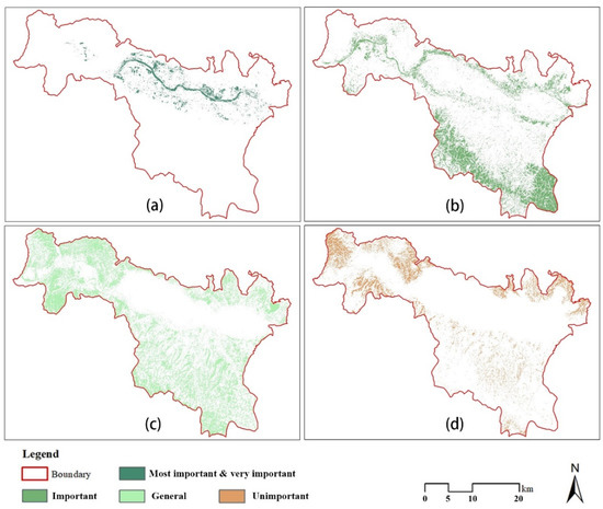 Distribution of: (a) the most important and very important, (b) important, (c) generally important, and (d) unimportant ecological land.