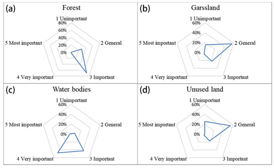 Distribution of ecological land by classification (unimportant to most important) and land type: (a) forest; (b) grassland; (c) water body; (d) unused land.