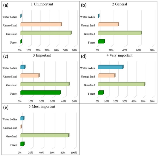 Percentages of the five types of ecological land as a proportion of all ecological land types within each level: (a) unimportant; (b) generally important; (c) important; (d) very important; (e) most important.