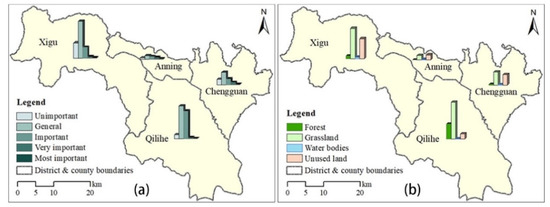Figure 6, which illustrates the proportions of various importance levels of the five ecological land types, shows that more than 40% of the grassland was classified as unimportant, generally important, important, and very important ecological land. In contrast, the proportion of grassland in the most important category is as high as 88.23%. Obviously, grassland makes up the highest proportion in all five types of ecological land. Therefore, from another perspective, grassland has most ecological potential in the core urban area of Lanzhou. In fact, Gansu Province, as one of the six major pastoral areas in China, has a total grassland area of about 14.17 million ha. The structural proportions of various ecological land types in the core urban area of Lanzhou reflect in miniature the distribution of land resources in Gansu Province, where grassland undoubtedly plays an important ecological barrier function across the landscapes of the province. In addition to ecological functions, the open and rolling grassland has a unique northwest-China charm in visual perception and provides excellent aesthetic value; many landscape perception studies have also pointed out that sparse forest and grassland, also known as savannahs, is the most popular landscape type among humans [47,48]. In addition, small ecological patches of grassland can effectively enhance the biodiversity of grass and other flowering plants [49], while large areas of grass and flowering plants can also form an effective ecological interface and provide sparse landscape nodes in a city, which is of great significance for wind and sand fixation, along with improving the urban landscape. However, the grassland in the core urban area of Lanzhou has not been fully given adequate attention. This is especially true for the wasteland areas outside urbanized Lanzhou, which suffer from a lack of planning and management meaning they face the risk of further ecological deterioration at any time. Therefore, city managers should strengthen the use and reestablishment of urban grassland, and bring into full play the ecological, social, and economic benefits of grassland during the development of urban land.