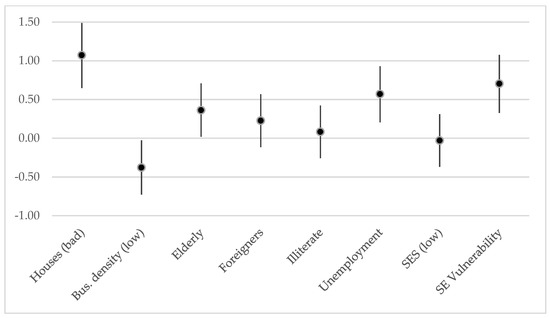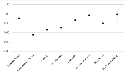 Physical space problems were measured by analysing housing conditions (percentage of houses in poor conditions). This indicator is commonly used to measure urban vulnerability [66]. In addition to the unemployment rate, four indicators have been designed to measure eligibility criteria for social exclusion. Population ageing (percentage aged ≥ 65 years), illiteracy rate (percentage of the population aged ≥ 16 without formal education), and the percentage of immigrants from countries other than the EU and North America as a proxy of immigrant and minority groups with social integration needs.