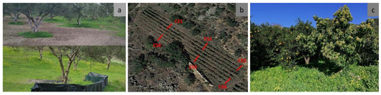 (a) Tilled plot (up) and non-tilled plot (down) at the olive orchard site, (b) positions of the cross sections (CS) in which soil erosion measurements were performed at the vineyard site, and (c) oranges and avocado trees at the fruit orchard field.