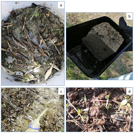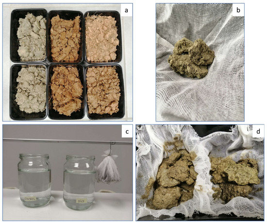 (a) Soil aggregates from both plots (control and SICS) of the three study sites: air-drying before slaking test, (b) 100 g of three aggregates of the Astrikas field to be used for the slaking test, (c) soil aggregates into the mesh before being immersed to water, and (d) soil aggregates after the immerse to water.